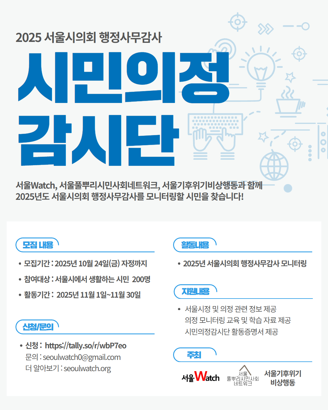 오늘 까지 신청이에요! 👀 시민의 눈으로 직접 지켜보세요! 서울시의회, 정말 시민을 대변하고 있을까요? 우리가 위임한 권력이 어떻게 쓰이는지, 행정사무감사를 모니터링할 시민의정감시단을 모집합니다.