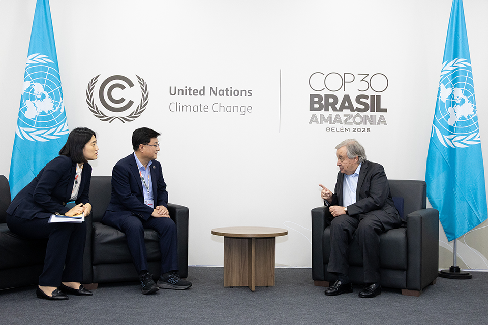 COP30에서 안토니오 구테흐스 유엔사무총장과 면담 중인 김성환 기후에너지환경부 장관 (출처: 기후에너지환경부)