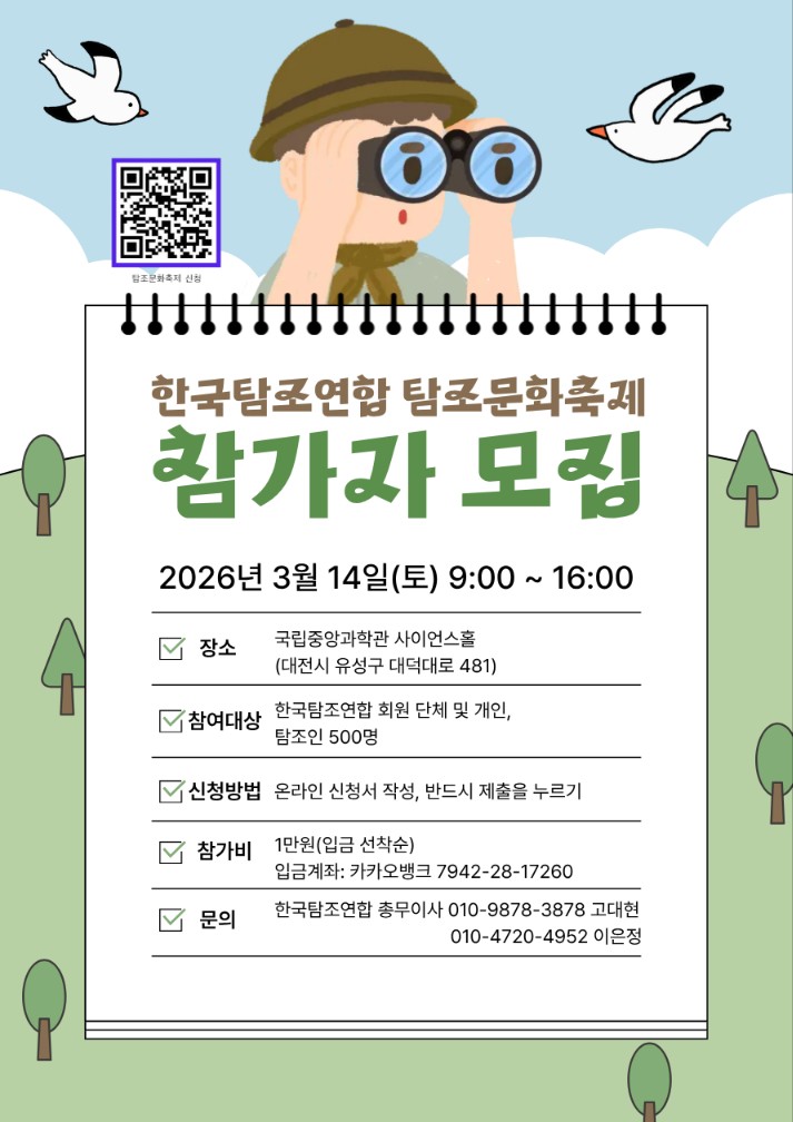 한국탐조연합은 다양하고 건강한 탐조문화를 만들어가기 위해 우리나라 곳곳에서 활동하고 있는 탐조단체와 탐조인들의 네트워크입니다. 2026년 3월 14일, 국립중앙과학관 사이언스홀에서 전국의 탐조인, 탐조단체들이 참여할 수 있는 '탐조축제'가 열립니다. 바람직한 탐조문화증진과 탐조인의 자발적 참여로 건실한 한국탐조연합 기틀 마련, 그리고 지역에서 보전과 현명한 이용이 공존할 수 있도록 여러분의 많은 참여를 바랍니다.