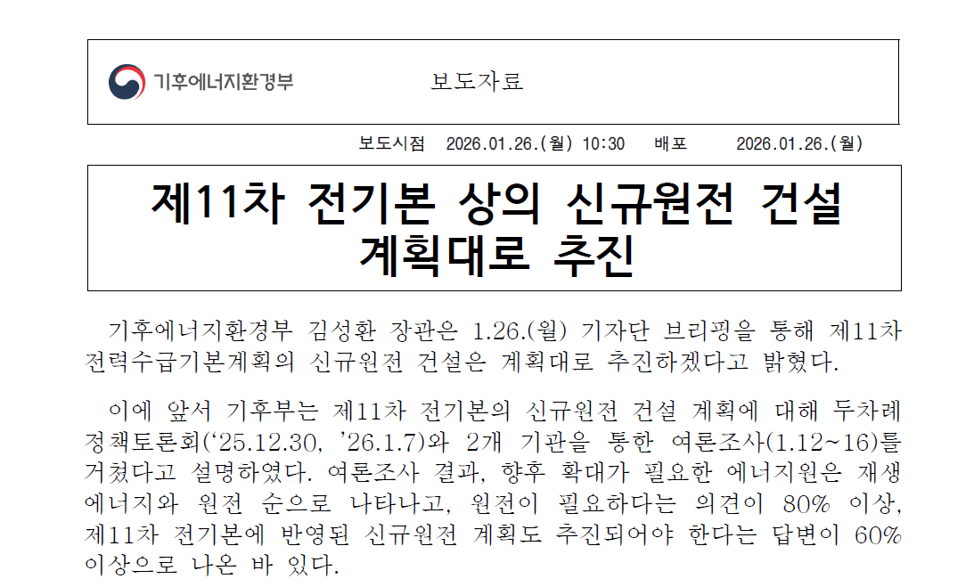 신규원전 건설 관련 기후보 보도자료 (출처: 기후에너지환경부)