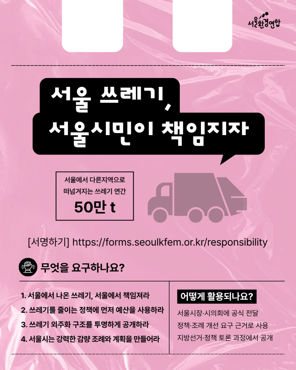 서울 쓰레기가 다른 지역으로 떠넘겨지며 대기오염과 막대한 예산 낭비를 초래하고 있습니다. 이제는 '외주화'를 멈추고 서울 스스로 줄이고 처리하는 발생지 책임 원칙을 세워야 할 때인데요. 서울환경연합은 쓰레기 감량 조례 제정과 예산 우선 편성을 요구하는 시민 서명을 모아 서울시장과 시의회에 전달하고자 합니다. 서울이 책임 있게 처리하는 도시가 될 수 있도록, 서명으로 힘을 보태주세요!